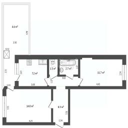 Планировка: 2 изолированные комнаты (25.7 м²) + кухня 7.2 м².