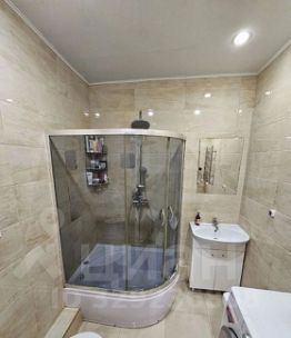 Укомплектованная ванная комната, унитаз, раковина с тумбой, глубокая и вместительная душевая кабина
