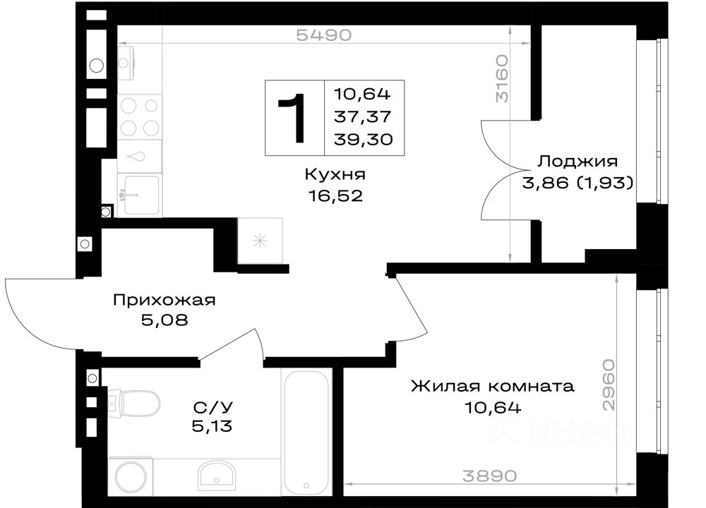 Общая площадь39,3 м²
