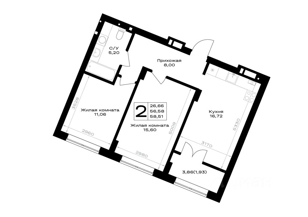 Общая площадь58,51 м²