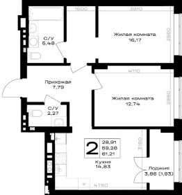 Продается 2-комн. квартира, 61,21 м²