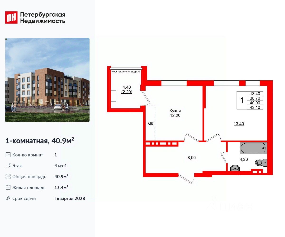 Удобная, классическая планировка, кухня 12.2 м², просторная прихожая 8.9 м². Общая площадь квартиры - 40.9 м², жилая 13.4 м², высота потолка 3 м.