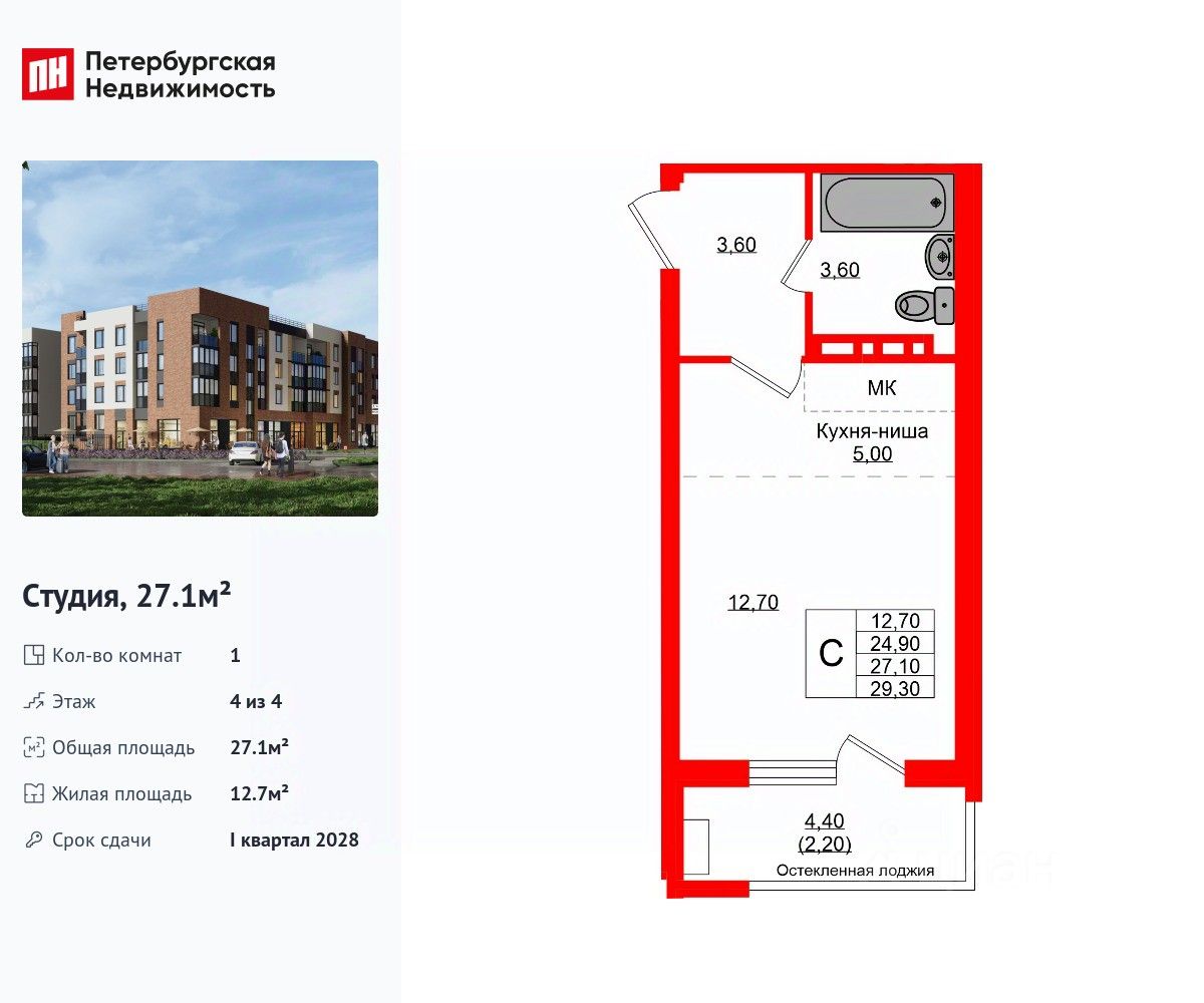 Удобная, классическая, функциональная европланировка, большая кухня-гостиная 5 м², просторная прихожая 3.6 м². Общая площадь студии - 27.1 м², жилая 12.7 м², высота потолка 3 м.