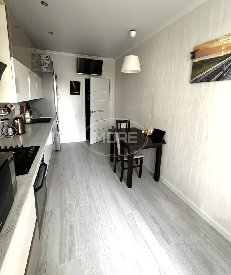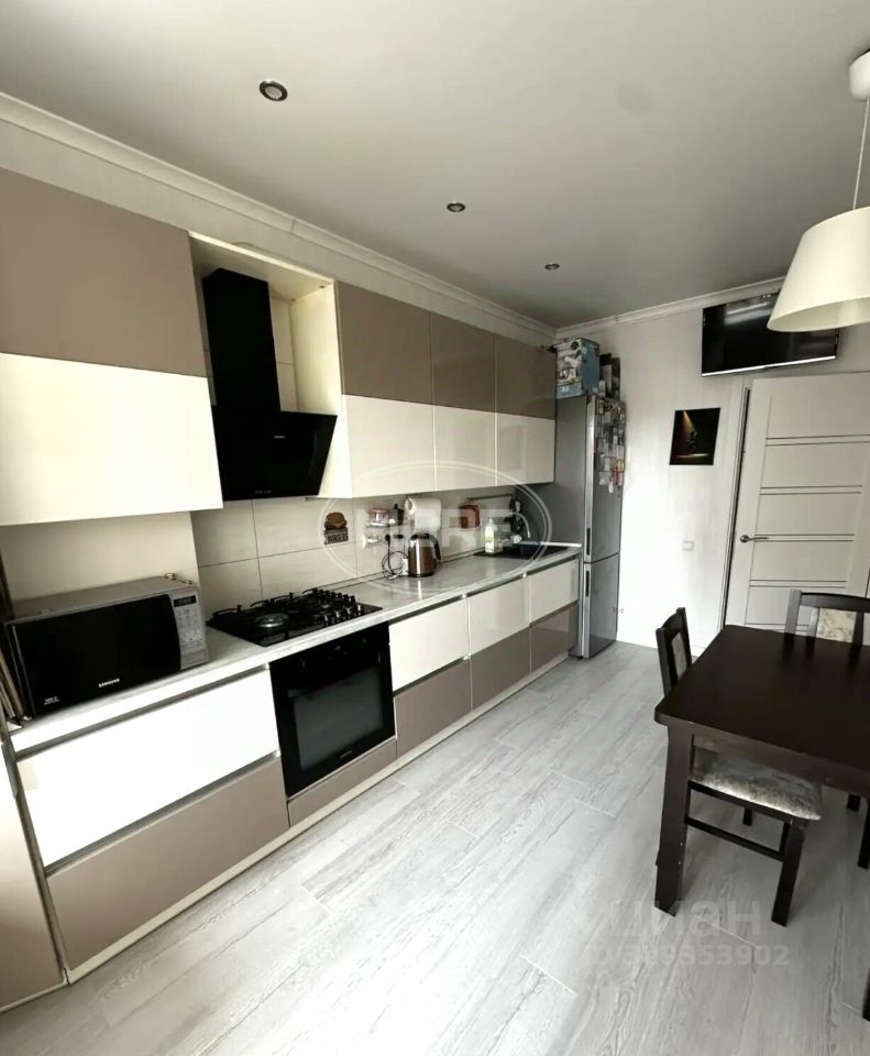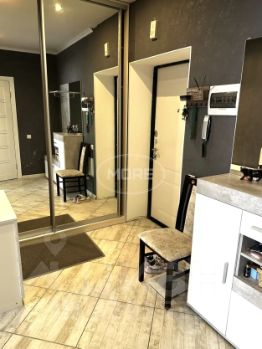 При продаже новым собственникам останется встроенная кухня с техникой: вытяжка, газовая плита, холодильник, духовка. В коридоре большой встроенный зеркальный шкаф.