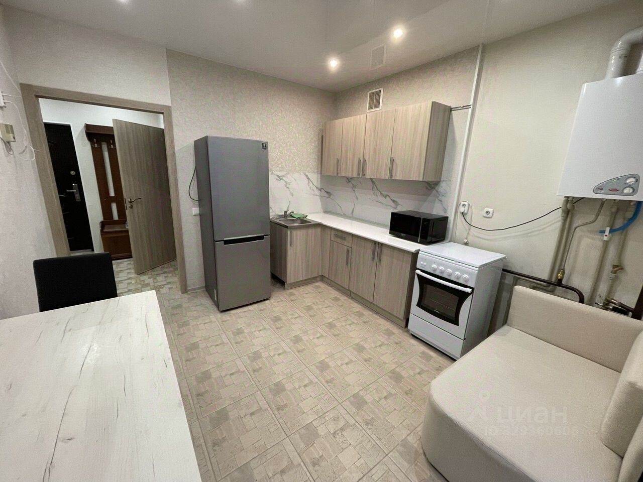 По всей квартире натяжные потолки, кафель , ламинат, всё как и должно быть. В санузле теплый пол. Из просторной кухни выход на большую застекленную лоджию из которой при желании можно сделать кабинет, туда легко войдет компьютерный стол. Комната светлая, просторная, в комнате есть ниша под шкаф-купе.
