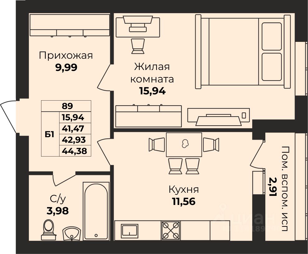 Общая площадь42,93 м²
