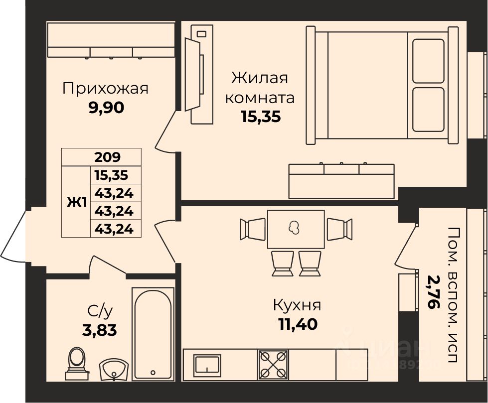 Общая площадь43,24 м²