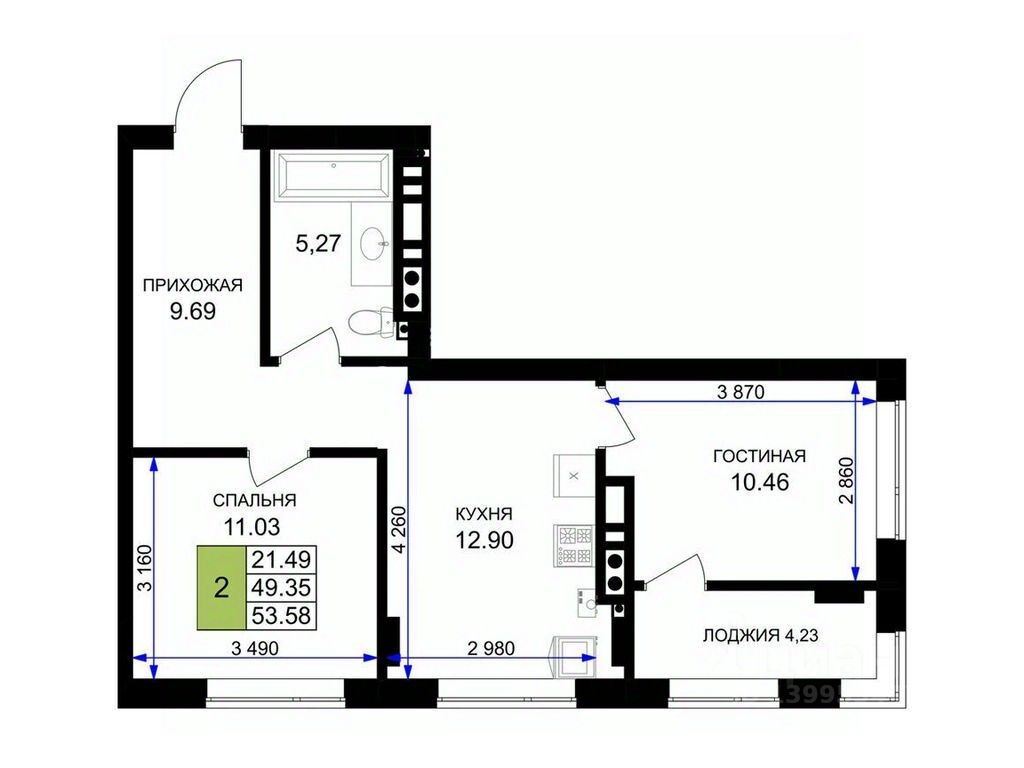 Общая площадь54,3 м²