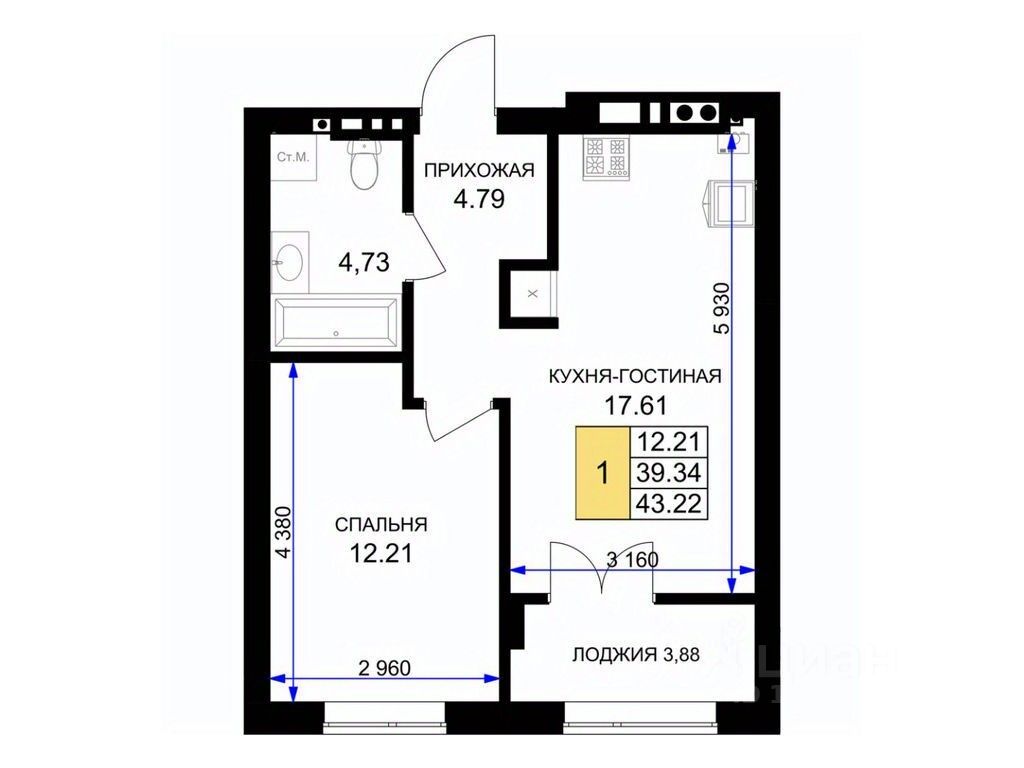 Общая площадь43,6 м²