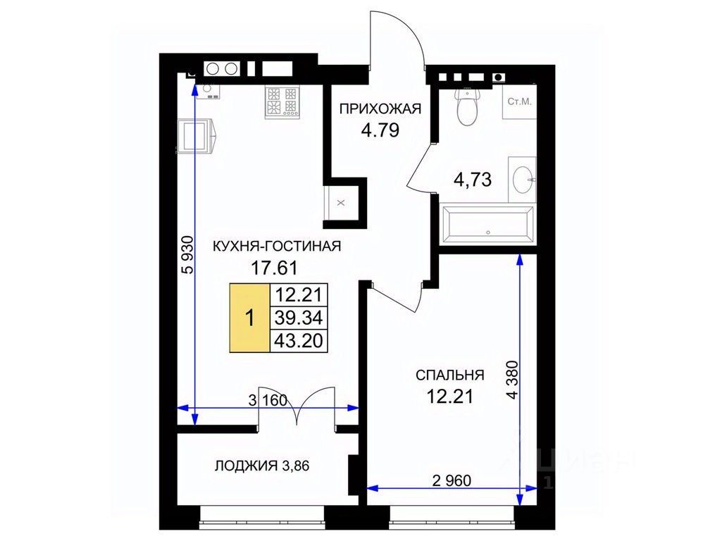 Общая площадь44,1 м²