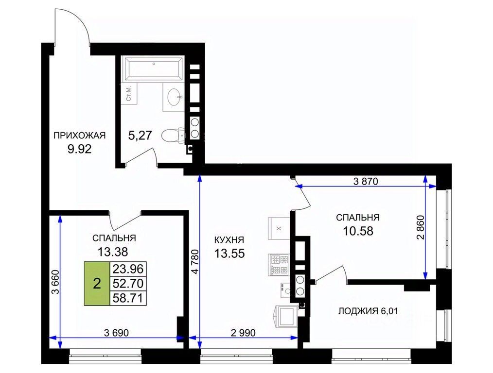 Общая площадь59,5 м²