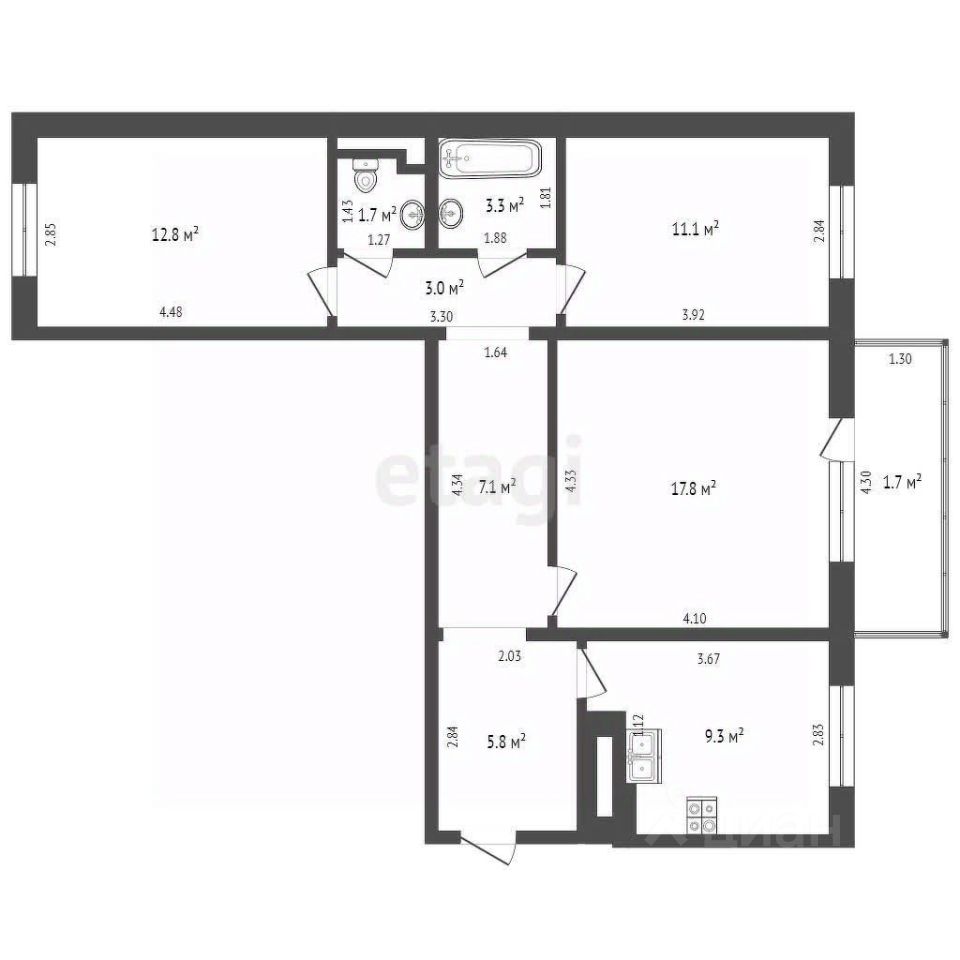 -Ванная и с/у - 3,3 и 1,7 м2