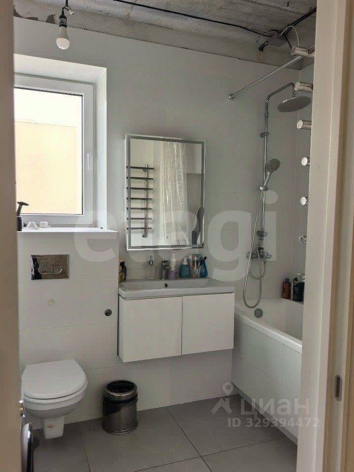 В квартире два санузла. Основной санузел полностью готов: плитка, тёплый пол, инсталляция, раковина с тумбой, зеркало и ванна. Здесь есть окно, потолок не натяжной. Второй санузел требует отделки — пока установлена только дверь.
