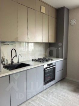 Кухня оформлена: поклеены обои, установлен натяжной потолок и люстра. Встроен кухонный гарнитур с техникой — газовая плита, духовой шкаф и место для посудомойки.
