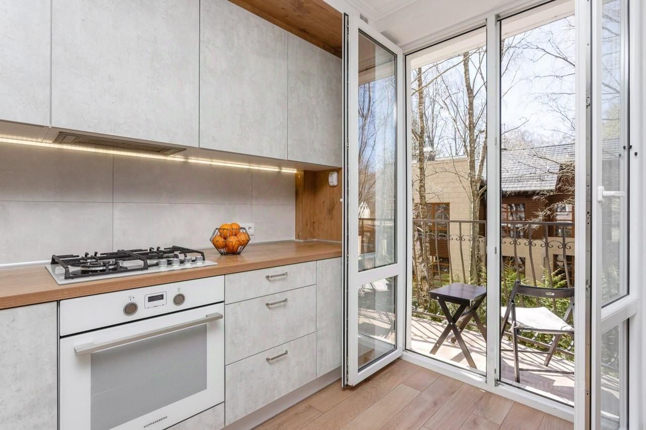 Просторная кухня-гостиная 31,2 кв.м с тремя большими окнами и балконом.