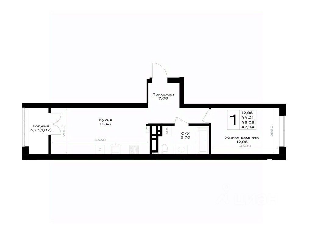 Общая площадь46,08 м²