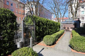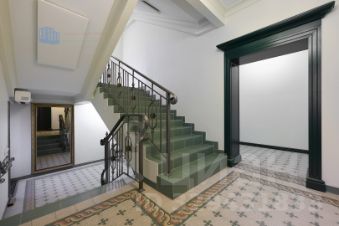 в отделке холла и подъезда угадывается дух старого Кенигсберга: кованые перила, элементы из натурального дерева, керамическая плитка- вписаны в единый стилистический контекст.