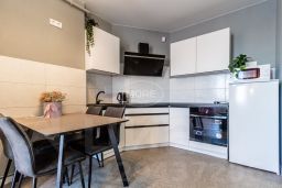 Современная встроенная кухня, двухспальная кровать, вместительный шкаф, кухонный стол со стульями и другие предметы интерьера остаются.