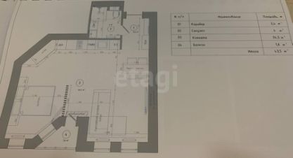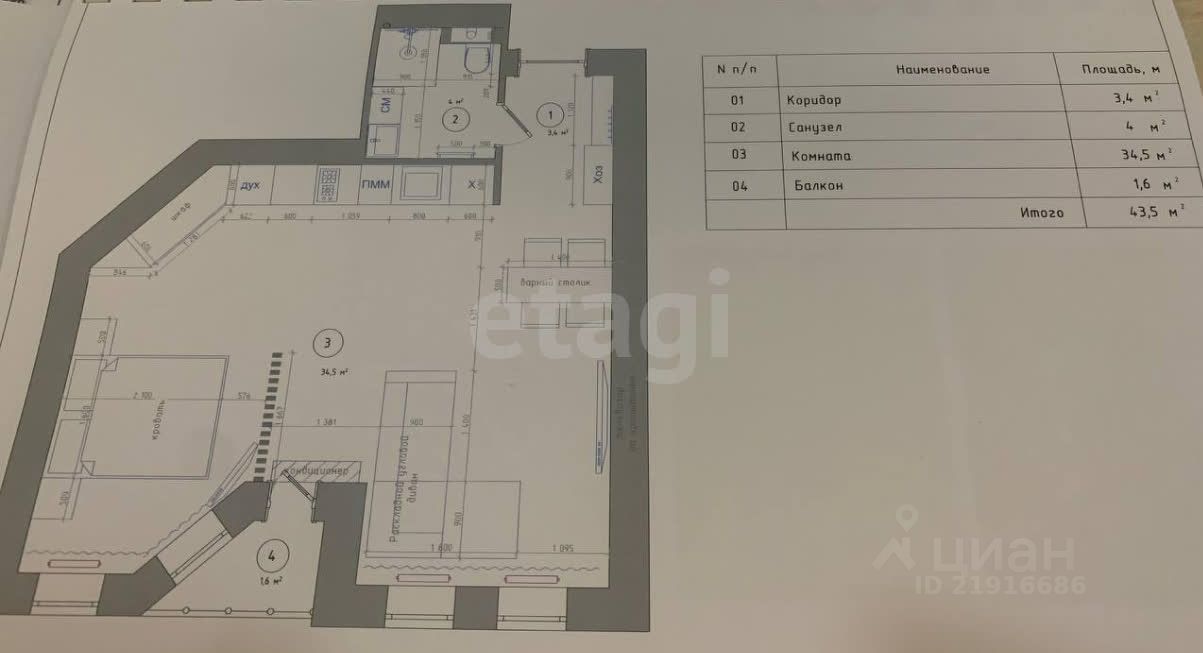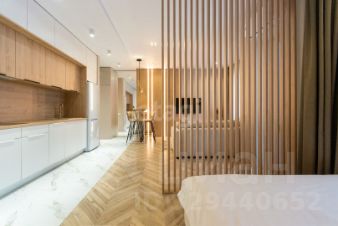 - Площадь студии составляет 41,4 кв. м., из которых 34 кв. м. — полезная жилая площадь.