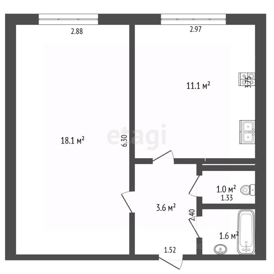 две комнаты — 18,1 м² (просторная гостиная/спальня) и 11,1 м² (уютная вторая комната).
