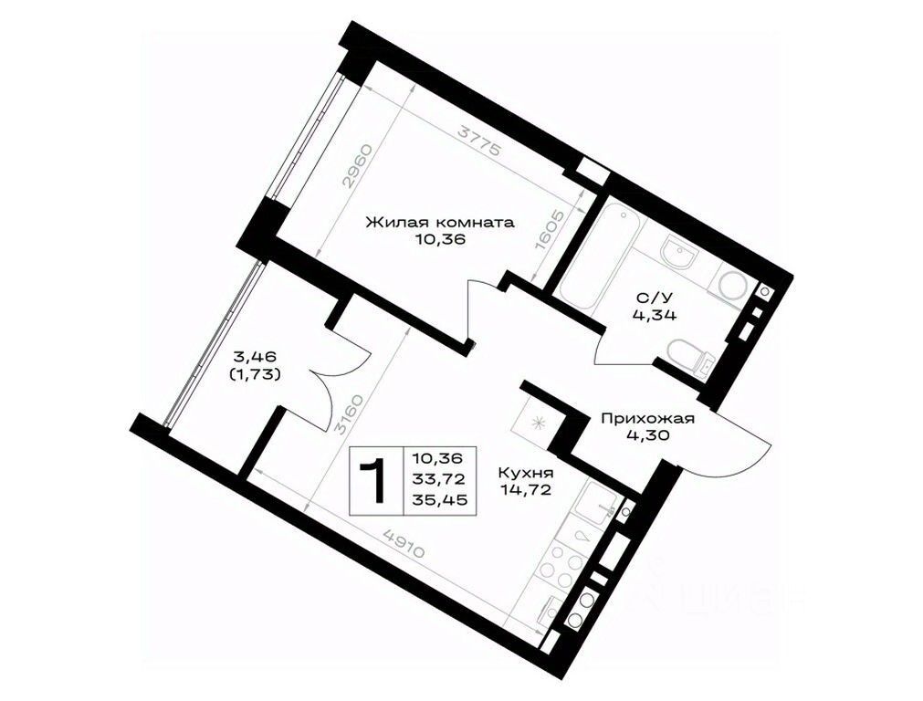 Общая площадь35,45 м²