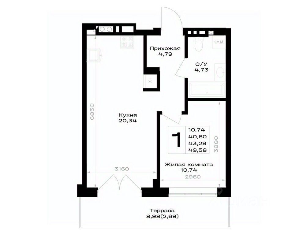 Общая площадь43,29 м²