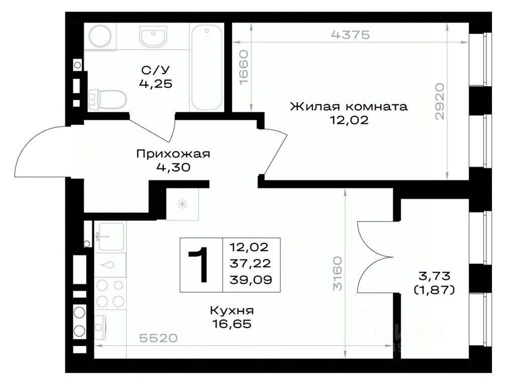 Общая площадь39,09 м²