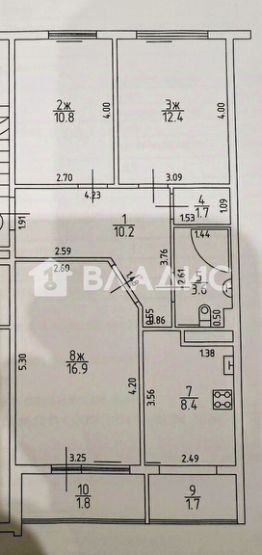 Общая площадь - 64 кв. м., жилая - 40,1 кв.м., комнаты изолированные - 16,9+12,4+10,8 кв.м., кухня - 8,4 кв.м., центральное отопление, установлены счётчики на воду, газ и электричество.