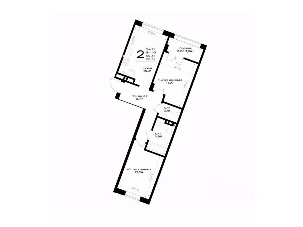 Общая площадь56,37 м²