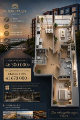 Продается эксклюзивная 3-комнатная квартира площадью 93 кв.м. на 2 этаже нового ЖК комфорт класса, расположенного в курортном городе Зеленоградск на побережье Балтийского моря.