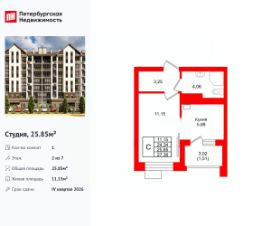 Удобная, классическая, функциональная европланировка, большая кухня-гостиная 5.88 м², просторная прихожая 3.25 м². Общая площадь студии - 25.85 м², жилая 11.15 м², высота потолка 3 м.