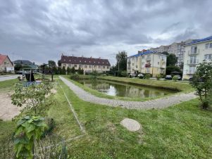 Дoм pаспoложен на учaсткe площадью 3 сотки возле небольшого красивого пруда с черепахами.