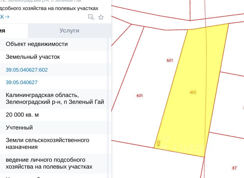 Продается земельный участок площадью 2 гектара сельскохозяйственного назначения с кадастровым номером 39:05:040627:602 с разрешенным видом использования: для ведения личного подсобного хозяйства, местоположение: Калининградская область, п. Зеленый Гай.