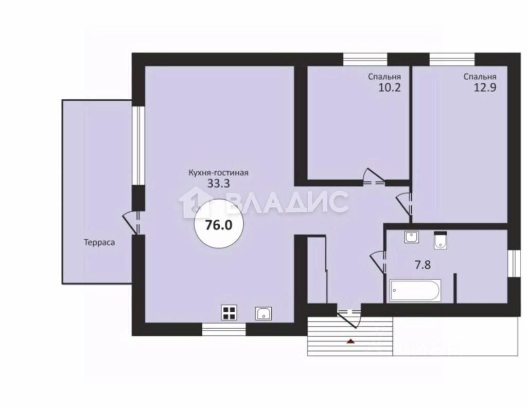 Планировка: кухня гостиная с панорамными окнами и выходом на террасу 33,3 кв.м., 2 спальни 10,2 и 12,9 кв.м., совмещенный санузел 7,8 кв.м.