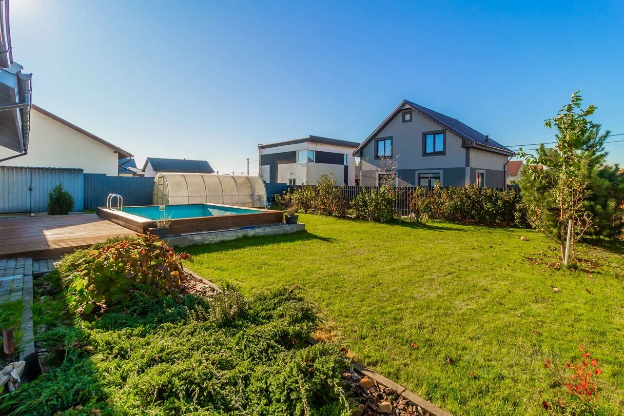 С гостиной имеется выход в большой двор, где оборудована теплица, сад, площадка с бассейном (6*4 м) с подсветкой.