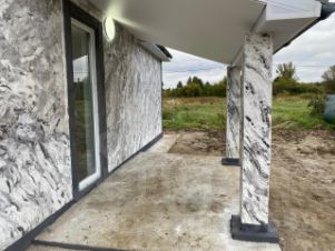 Стены возведены из пеноблока 250 мм плюс 50 мм утеплителя,покрыт декоративной штукатуркой.