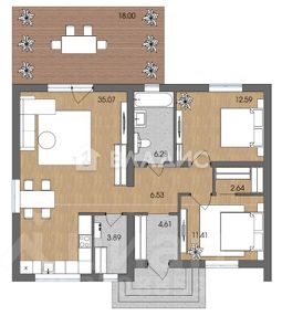 2 изолированные комнаты 13 и 12 кв. метров, большая кухня-гостиная 35 кв. метров, совмещенный с/у, гардеробная и терраса 18 кв. метров.
