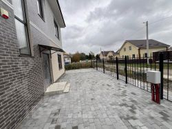 Участок огорожен кованным забором по фасаду и сетка по периметру, ворота, калитки, парковка на 4 машины.