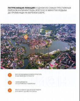 Дом шикарно расположение в центре города и в то же время вдали от суеты и шумных дорог. За пешей прогулкой по тихим улочкам вы не заметите как окажетесь на набережной "Верхнего" озера. Так же в шаговой доступности вся инфраструктура: магазины, аптеки, отделения почты и банков, торговые центры, несколько школ, фитнес-центр, ботанический сад, музеи, БФУ им. Канта, Музей Янтаря, Резиденция Королей. На автомобиле можно без проблем выехать в центр города, к морскому побережью, за город или в аэропорт. До основных магистралей Калининграда и скоростного Приморского кольца всего несколько минут езды.