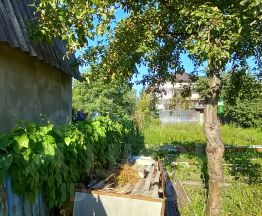 На участке растет яблоня и слива. Грядки под посадку овощей и ягод.