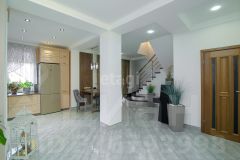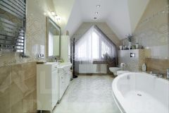 В напольных покрытиях преобладает керамогранит, на втором ламинат, межкомнатные двери, лестница из натурального дуба.