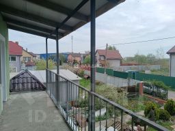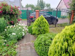 - огорожен со всех сторон: есть ворота и площадка для парковки автомобиля