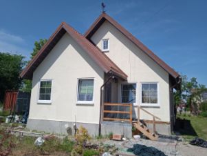 Светлый теплый дом 9на10м с мансардой 30мв состоянии "заезжай и живи" на большом участке в центре поселка почти у остановки в 9 км от центра Калининграда, скважина своя 63 и питьевая вода в доме, проводной интернет и телефон, дом термос летом не жарко, зимой не холодно, тариф по свету сельский и зимой с отоплением платим 5000. Дом заводской сборки крупнейшей в России фирмы по каркасным домам Тамак по австрийской франшизе, качество приятно удивляет, срок службы70-100лет, ни 1 проблемы с домом не было. Участок очень большой, ровный и сухой, подсыпали грунт пару лет для выращивания сада, цветов для продажи и огорода, есть теплица и вода проложена на участке в 5 местах, также кабеля под видеокамеры и для автоматических ворот, сейчас откатные, участок огорожен. Рядом детская площадка и медпункт, дорога асфальт, на участке парковка на4 машины, есть фундамент для бани или дома. В школу детей возит автобус, в поселке есть магазины, аптека, супермаркет Пятерочка, спортзал, парикмахерская, 300домов, все услуги доступны внутри посёлка.