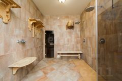 сауна комфортно вмещает шестерых взрослых, так же здесь находится душевая и бассейн. Имеется две комнаты для переодевания, каждая со своим сан.узлом. Из бассейна и из гостиной имеется выход на террасу, где можно посидеть на свежем воздухе, отдохнуть после парилки или насладиться любимыми напитками