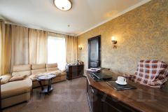 в гостиной может одновременно разместится 16-20 человек, вся мебель из натурального дерева, так же делалась на заказ (2 больших стола, 16 стульев, 2 кожаных дивана, 2 журнальных столика, большой комод-тумба, ТВ, кондиционер)