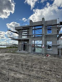 • Стены - монолитный ж/б каркас (колонны 300х300 мм), газобетон 400 мм + утеплитель 59 мм + воздушный зазор 30 мм + лицевой кирпич 120 мм
