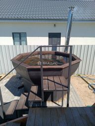 - слева от входа в дом установлен чан с подогревом: нержавеющая сталь 304 мм, 230 см в диаметре, имеет 8 граней. Помещается до 10 человек! Чан отапливается печью на дровах.