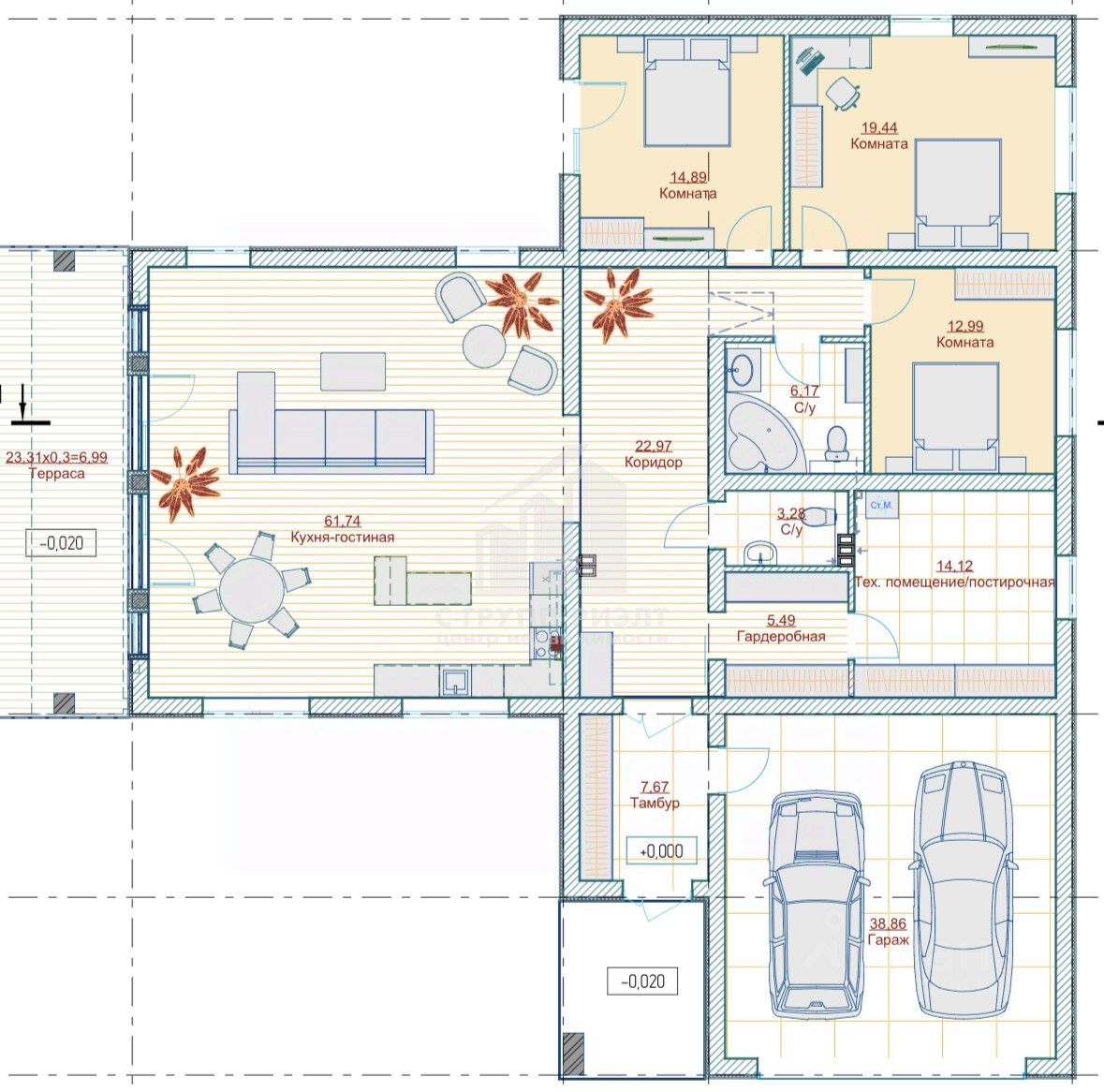 - просторная кухня - гостиная с высотой потолка в коньке 5 м и выходом на террасу;