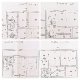 2 полноценных этажа, 3-й этаж- мансарда, цокольный этаж.