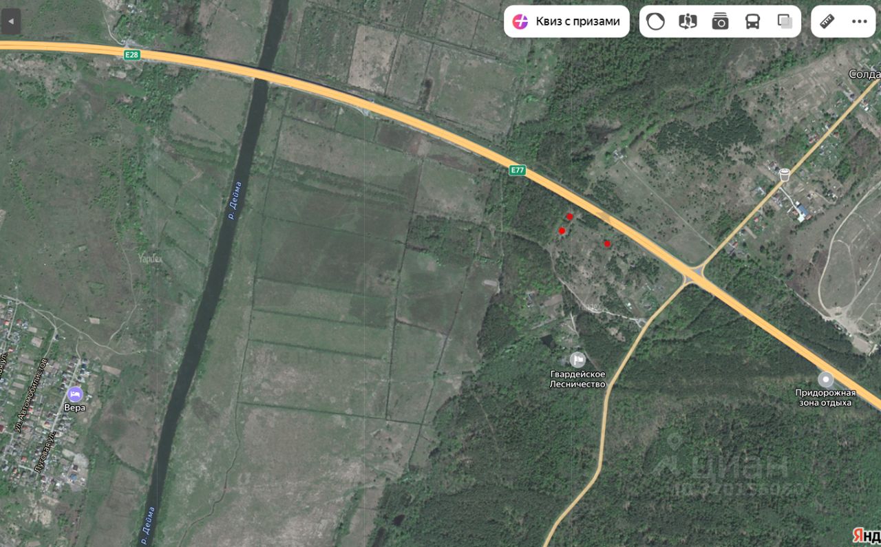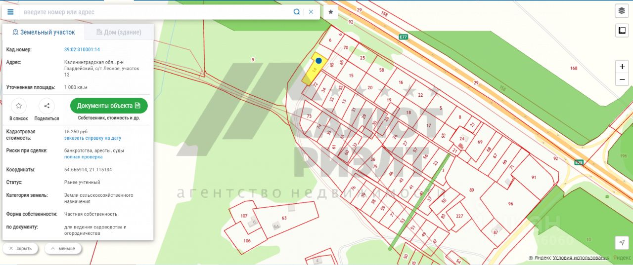 Участок в частной собственности, сухой, расположен на границе с/т Лесное, ул. Лесная, уч. 13, прямо на опушке соснового бора! Рядом трасса Калининград-Черняховск, перекрёсток на Гвардейск. До самого Гвардейска 5 минут на авто, 4 километра. До Калининграда - 25 минут (35 километров). Пешком до реки Дейма - 1 километр. Рядом подведён газ и электричество. Соседи ведут активное строительство. Ограничений / обременений нет. Всего в продаже от собственника здесь три участка, все по 10 соток, один из них под коммерцию - для строительства гостиницы.